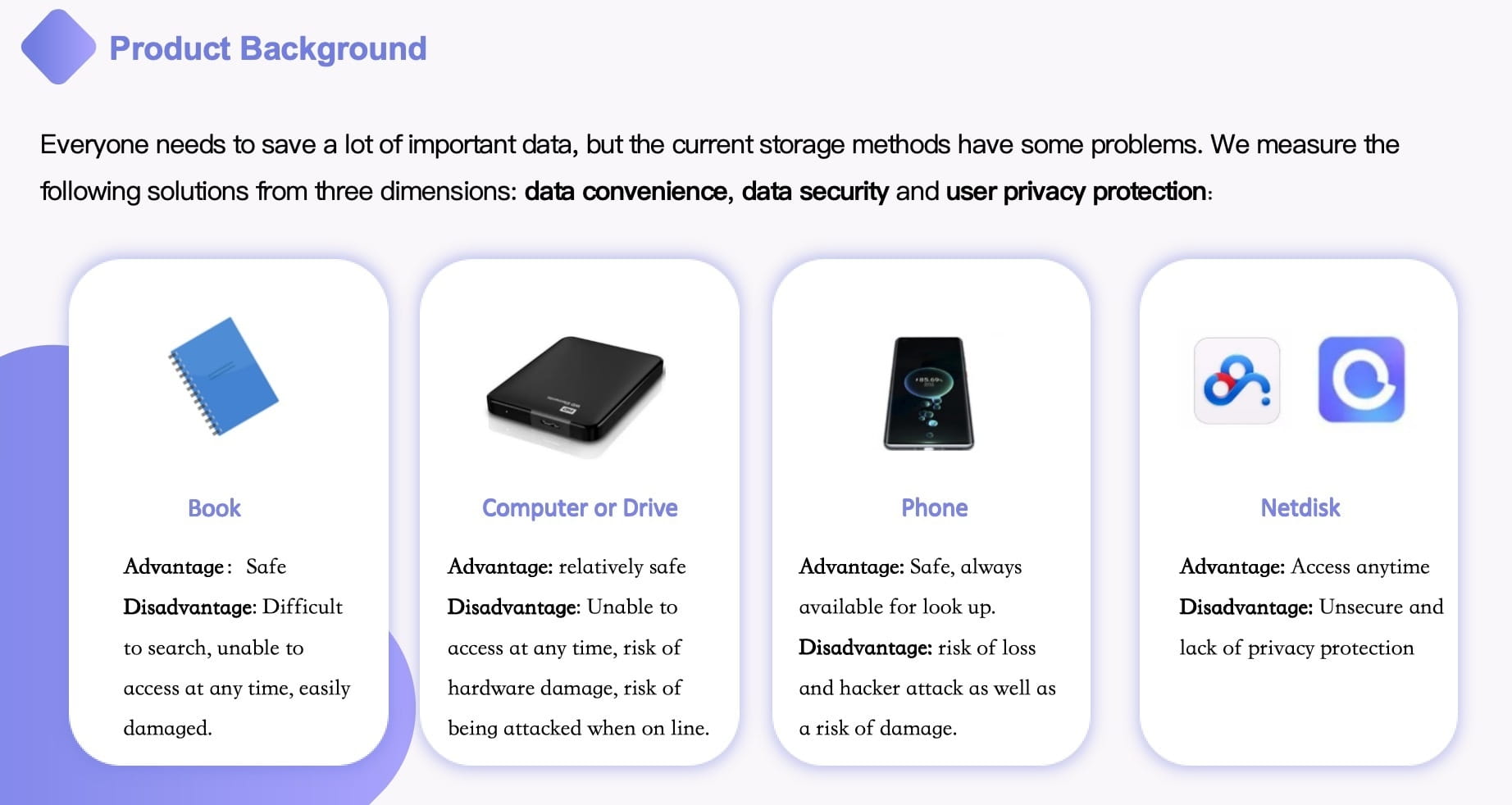 Un altro motivo è che ognuno di noi ha diversi dati importanti archiviati in luoghi diversi. Alcuni dati sono archiviati sul server del fornitore di servizi; altri sono archiviati sui nostri telefoni cellulari, computer di casa o dispositivi di archiviazione mobili a casa e alcuni dati non sono ancora stati digitalizzati, come i registri dei notebook o i ricordi nelle nostre teste, ecc. Tutti questi metodi di archiviazione dei dati presentano alcuni rischi e inconvenienti per la sicurezza. Ciò che viene memorizzato nella mente non deve essere troppo complicato o preciso. Ciò è determinato dalla natura della memoria umana. È vaga e facile da dimenticare, quindi per noi è sufficiente memorizzarla su un quaderno , o digitalmente. Oltre a non potervi accedere in qualsiasi momento, i dati sul dispositivo di memorizzazione rischiano di essere danneggiati o addirittura persi mentre i dati sono archiviati sul server del fornitore di servizi, sebbene sia possibile accedervi in qualsiasi momento tempo, viene effettivamente condiviso con il fornitore del servizio. Oltre alla privacy, gli account possono essere chiusi per qualsiasi motivo in qualsiasi momento.