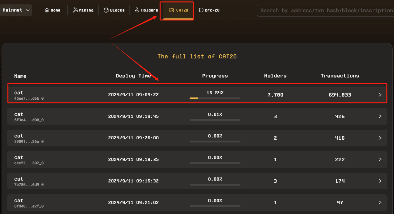 La pagina del sito Unisat supporta ufficialmente CAT20, ma attualmente non è possibile effettuare mint sul front-end. Forse presto sarà aperta la funzione di mint, ma potrebbe anche non essere così.