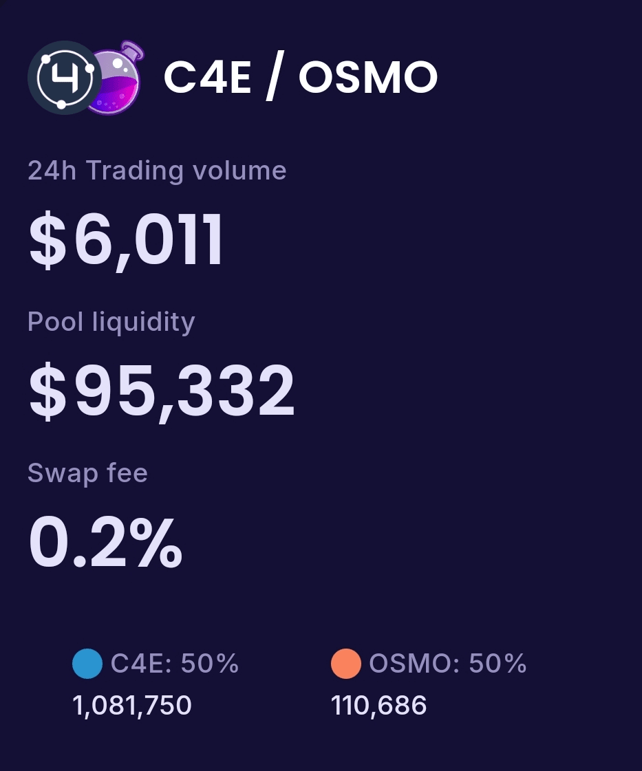 C4E ha annunciato un'opportunità per i fornitori di liquidità di vincolare i propri token C4E e Osmo tramite l'LP Pool su Osmosis, offrendo un APR interessante di quasi il 90%. Questa iniziativa mira a incoraggiare la partecipazione all'ecosistema Cosmos offrendo rendimenti più elevati per gli utenti che vincolano i propri token.