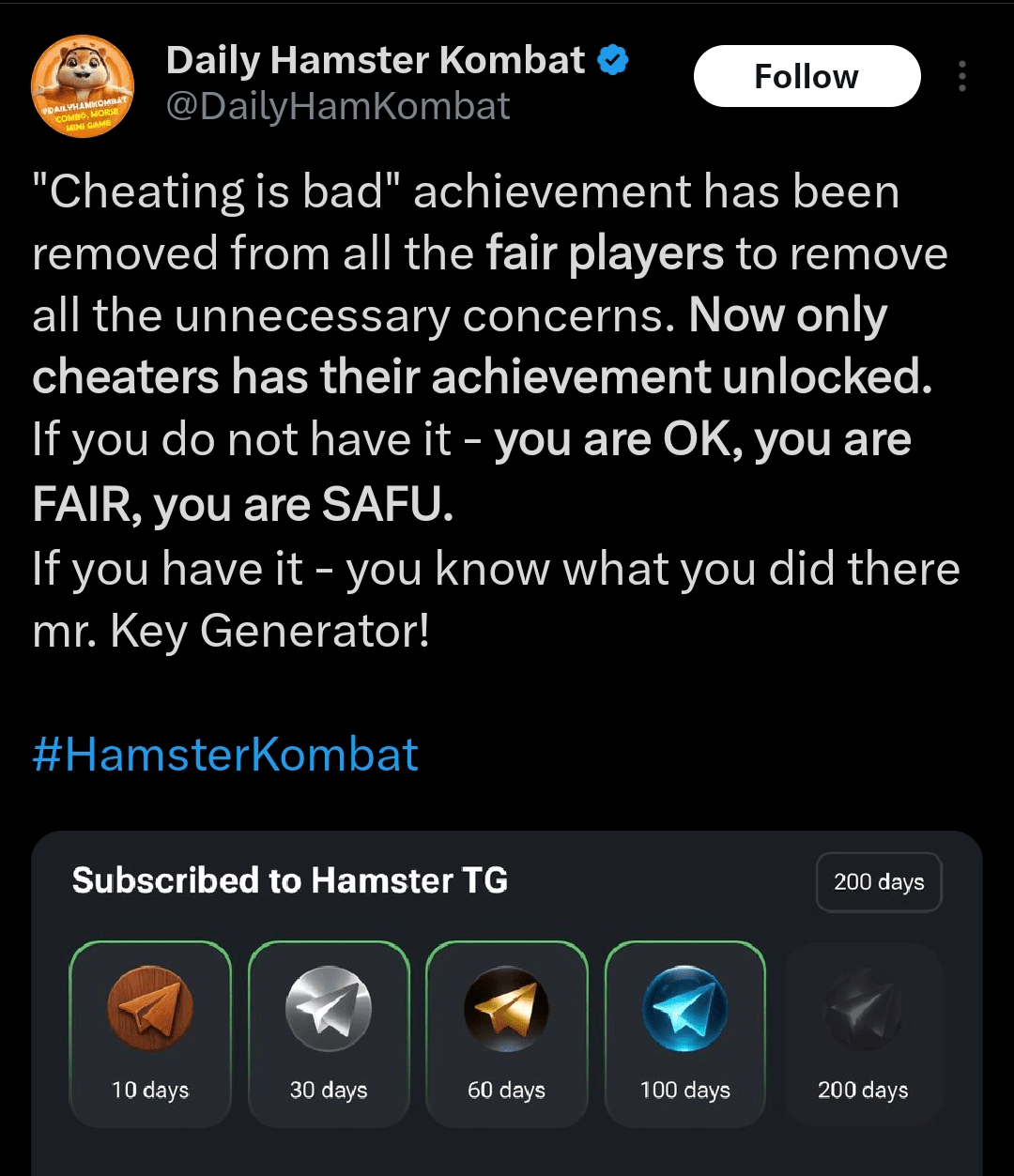 Ehi, Kombatants! đšâď¸ Ottime notizie! Hamster Kombat ha appena **schiarito** l'aria đ per tutti i giocatori onesti lĂ fuori! Se hai combattuto con onestĂ e senza scorciatoie, quella **carta imbroglio** è ORA SPARITA dal tuo account! đđ