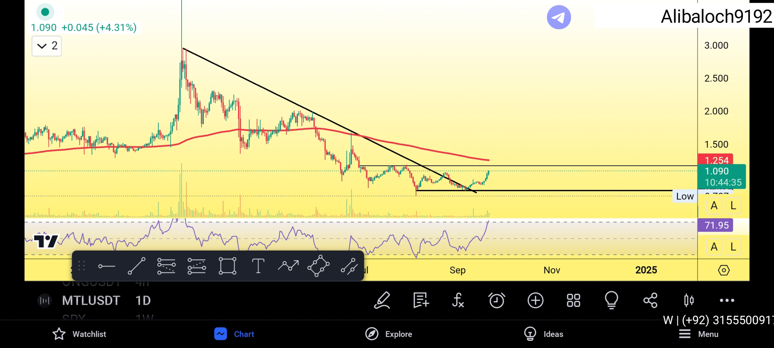 - Resistenza: il prezzo si sta avvicinando al prossimo livello di resistenza intorno a 1,254 USDT. Questa potrebbe essere una zona cruciale in cui i trader staranno attenti a un rifiuto o a un breakout.