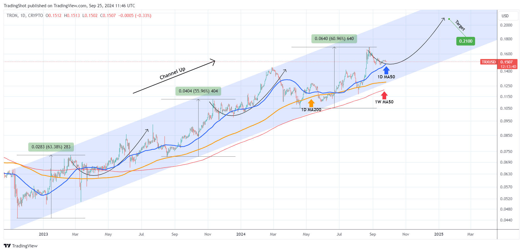 Tron (TRXUSD) è stato scambiato all'interno di un pattern Channel Up dal minimo del 14 novembre 2022. Il prezzo ora si sta ritirando dall'ultimo Higher High ma rimane sopra la MA50 1D (linea di tendenza blu).