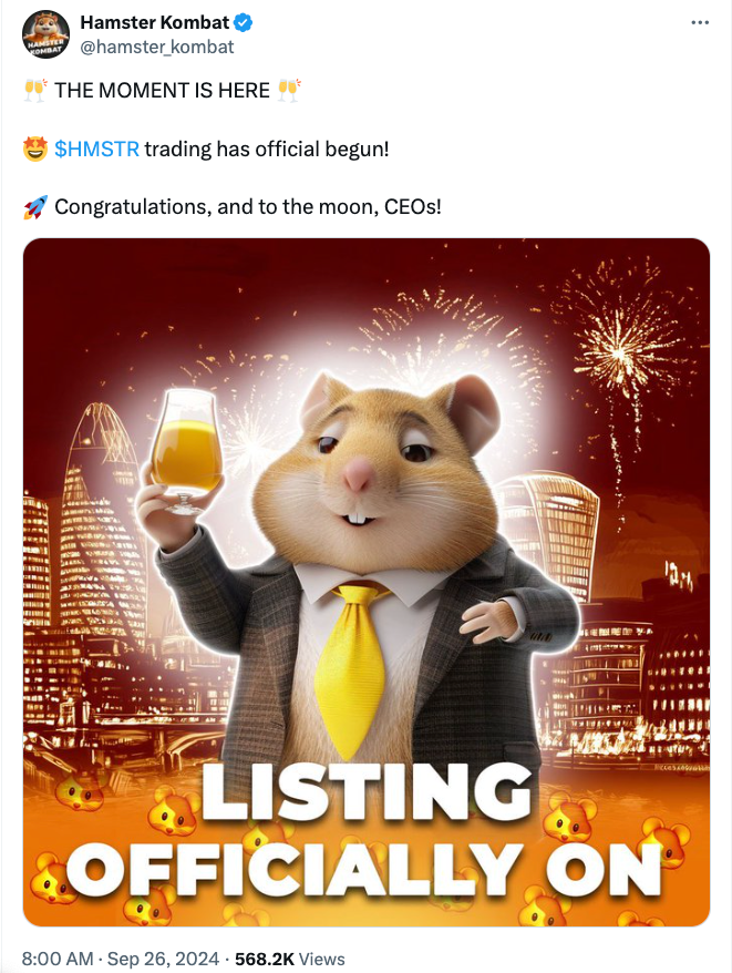 Hamster Kombat è andato su X per annunciare ufficialmente che il trading di HMSTR è iniziato. La notizia della quotazione è arrivata poco dopo che Hamster ha riferito che l'airdrop di HMSTR era attivo, con le opzioni di prelievo del saldo aperte intorno alle 12:00 pm UTC.