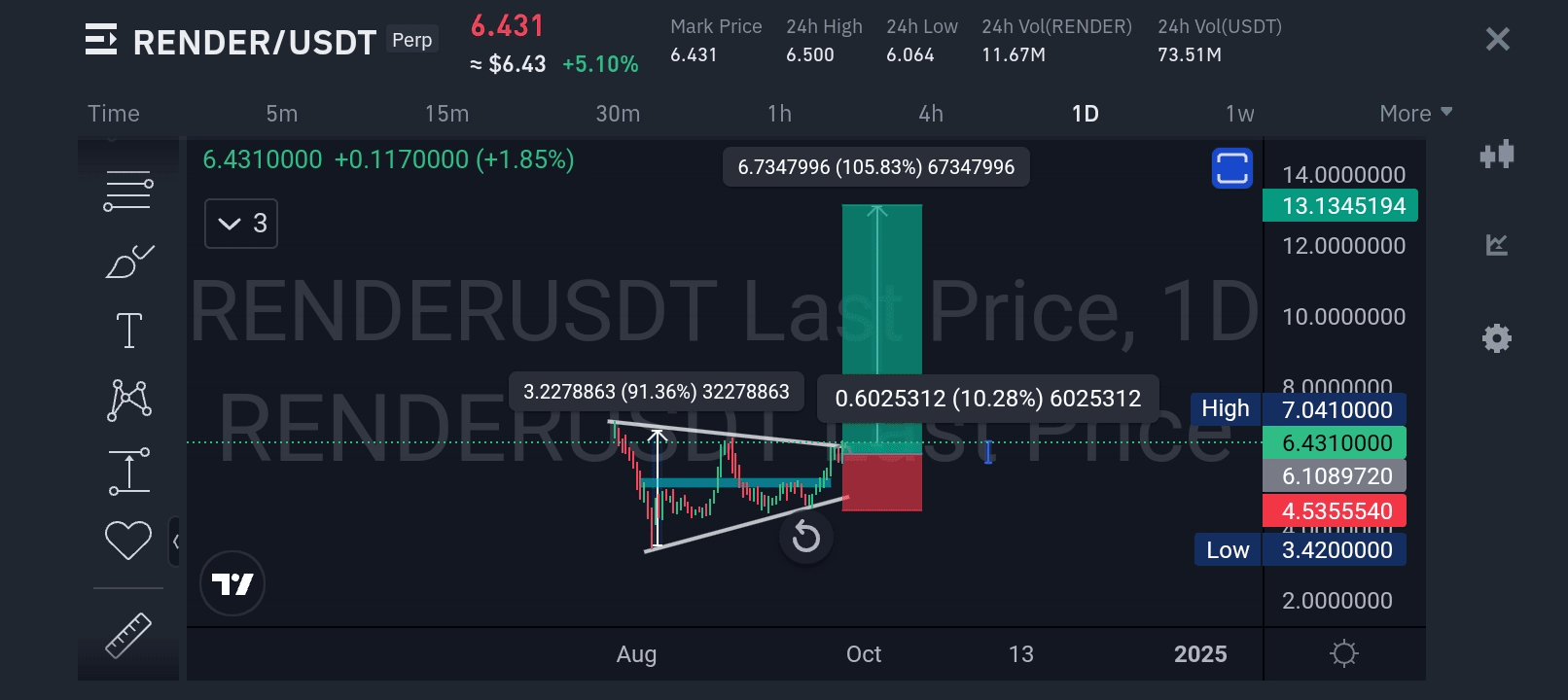 Ecco un'entusiasmante configurazione sulla coppia RENDER/USDT che ha catturato la mia attenzione. Il prezzo รจ attualmente fermo a $ 6,43 con un forte slancio rialzista. Stiamo assistendo a un breakout di triangolo simmetrico, che spesso porta a potenti movimenti verso l'alto.