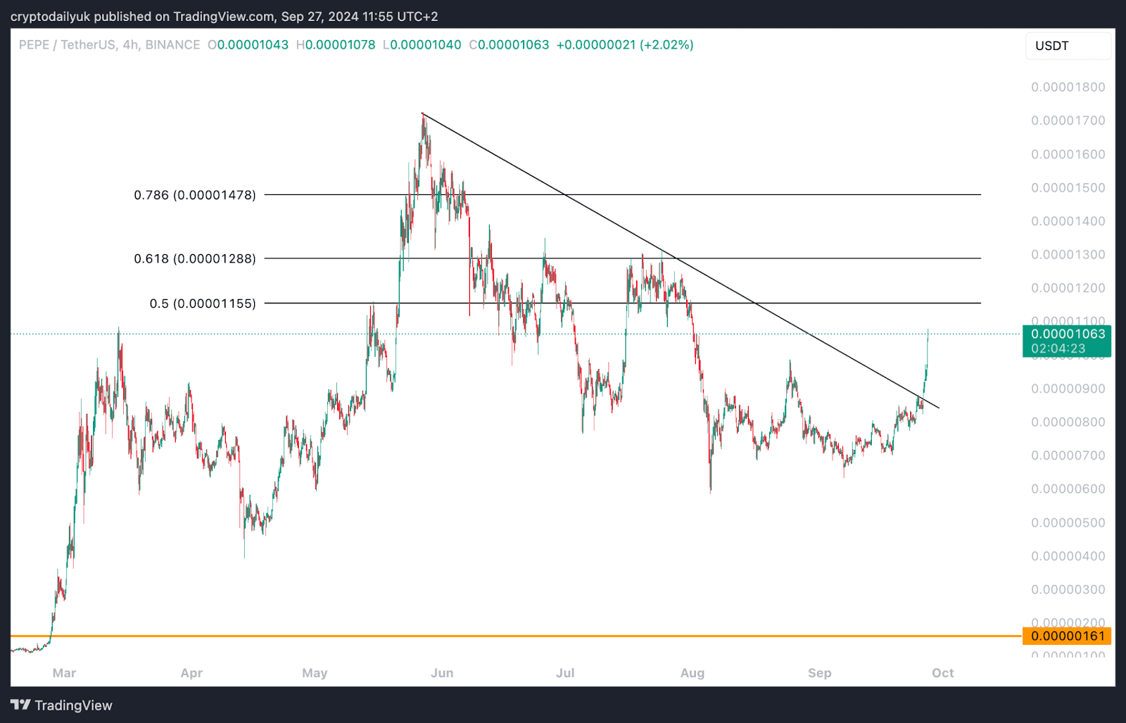 Il grafico a breve termine qui sopra mostra che il PEPE è attualmente in rialzo del 21,5%, da quando giovedì ha rotto la linea di tendenza al ribasso. Il prezzo sta salendo contro la resistenza in questo momento, ma se dovesse rompersi, gli obiettivi, secondo i livelli di Fibonacci, sarebbero $ 0,0000115 (Fibonacci 0,5), $ 0,000013 (Fibonacci 0,618) e $ 0,000015 (Fibonacci 0,786). Il massimo storico è $ 0,0000172.