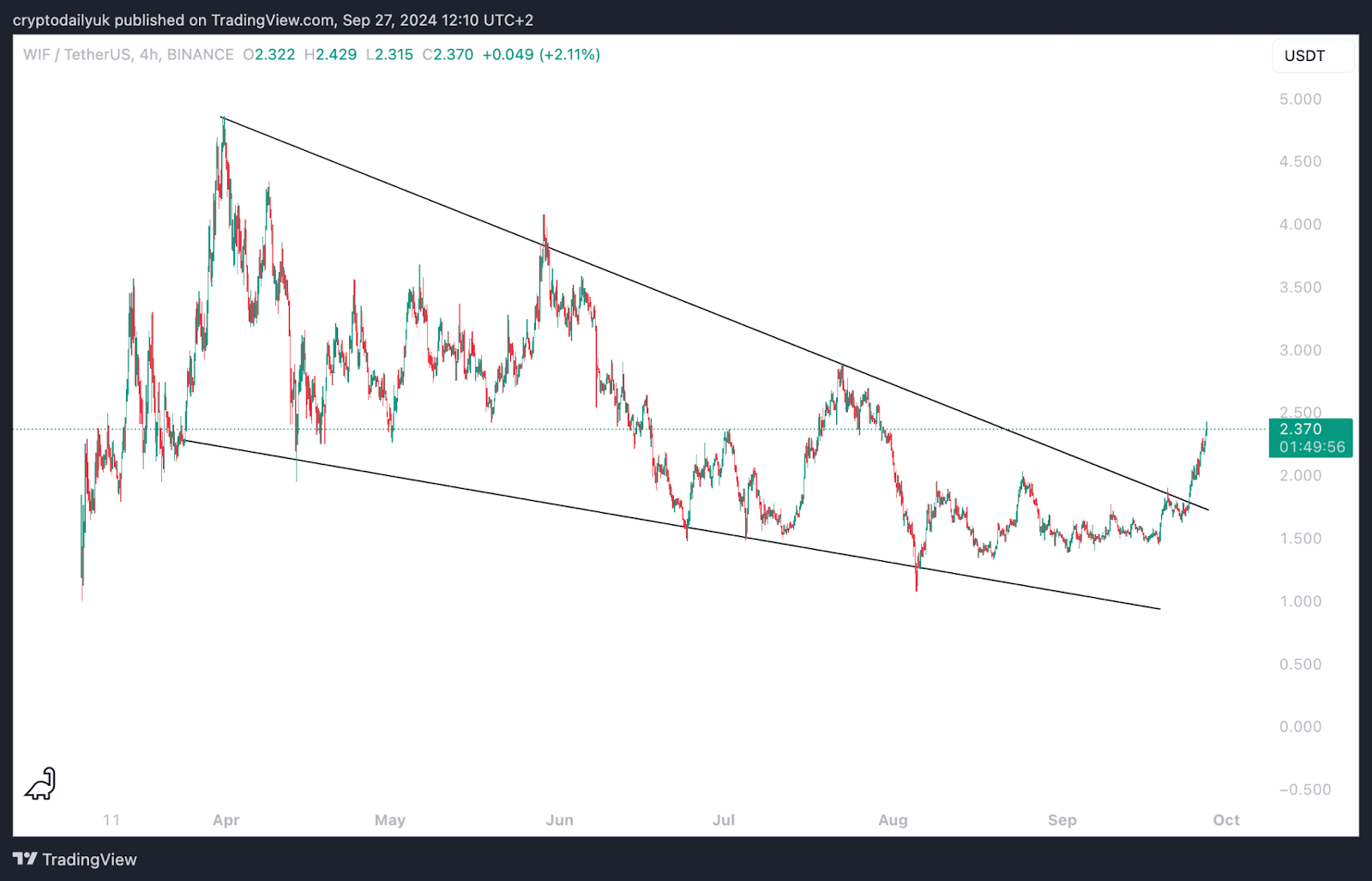Il prezzo#WIF(WIF/USD) si è mosso lateralmente all'interno di un cuneo discendente dall'inizio di aprile. Martedì si è verificato un chiaro breakout e da allora il prezzo è aumentato del 32,3%, a 2,36 dollari.