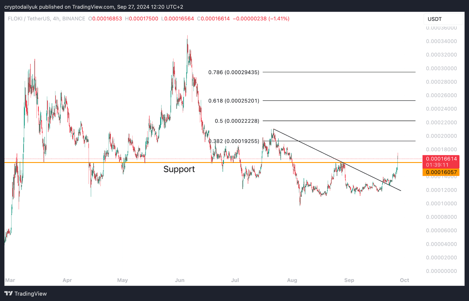Da quando ha rotto la linea di tendenza discendente e l'ha confermata, il prezzo di FLOKI #FLOKI/USD) è aumentato del 31%. Sembra che il prezzo potrebbe tornare a testare il forte supporto orizzontale a 0,00016 dollari prima di salire.