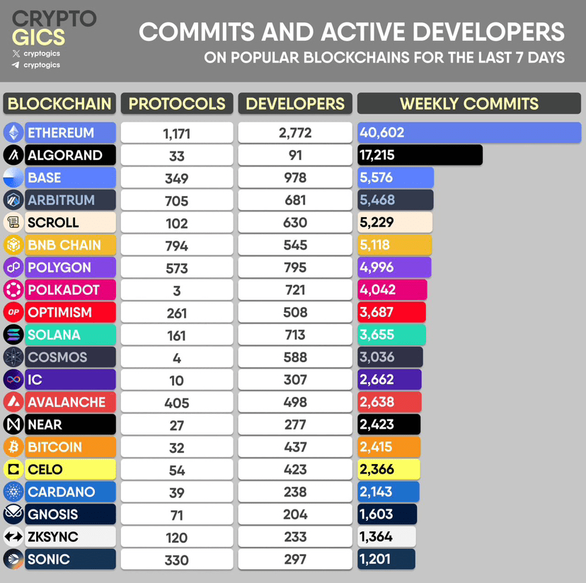 Ethereum è il leader indiscusso sia per numero di protocolli, con quasi 3.000 sviluppatori, sia per numero di commit, con oltre 40.000, confermando il suo dominio nell'ecosistema blockchain.