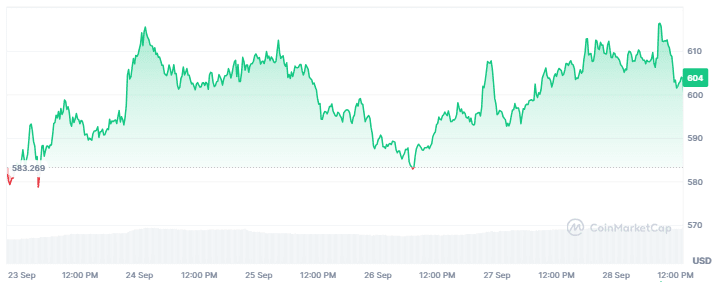 BNB era rialzista dal suo calo a $ 464,63 ad agosto, ma il processo si è accelerato a settembre. Ha spinto il valore da $ 540 a $ 616 nel corso del mese, rappresentando un aumento dell'11% nel corso del mese. Questo aumento è il risultato dell'hype attorno al rilascio dell'ex CEO di Binance, che è cresciuto nel tempo. Anche negli ultimi sette giorni, è aumentato del 4,27%. Tuttavia, questa domanda non è durata a lungo poiché il prezzo è sceso di nuovo, attualmente a $ 604.