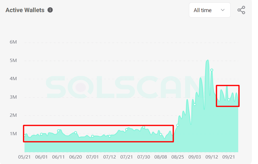 La rete Solana è stata notevolmente influenzata dalle monete meme, che hanno contribuito al suo ritorno. I dati di Solscan mostrano che gli indirizzi attivi giornalieri di Solana si sono stabilizzati tra 2,5 milioni e 3,3 milioni, il che rappresenta un aumento di oltre il 400% rispetto all'ultima zona di consolidamento che è durata da maggio ad agosto.