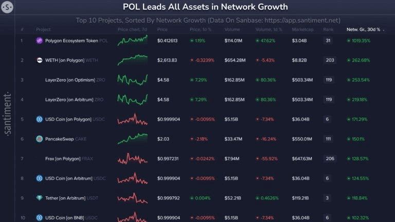 Scambiato a $0,43, il prezzo di POL mostra segnali di un'impennata, poiché la rete Polygon è cresciuta del 1.019% negli ultimi 30 giorni, secondo la classifica Santiment. Ciò lo rende una delle migliori alternative XRP da tenere entro dicembre.