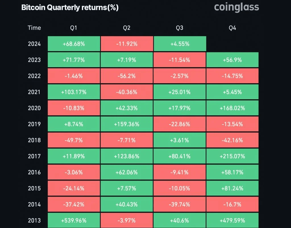 L'anno scorso, il 2023, si è rivelato un altro solido "Uptober" poiché il bitcoin è aumentato del 28,52%. Storicamente, il BTC tende a brillare nel Q4, con risultati positivi nel 63,64% dei casi dal 2013. Se il bitcoin inciampa nell'ultimo trimestre del 2024, quel numero scenderà al 58,33%. Tuttavia, se il BTC conclude il Q4 in positivo, la cifra salirà al 66,67%.