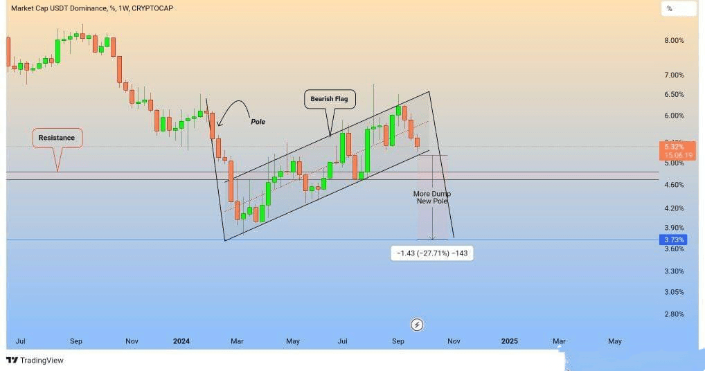 Poiché USDT.D è a pochi passi dal breakout della bandiera ribassista. Una volta completato con successo il breakout della bandiera ribassista.