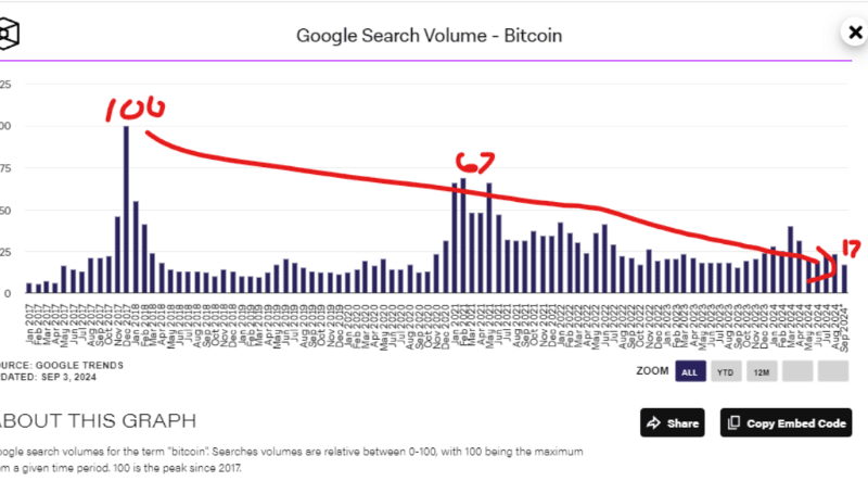 D’altro canto, permangono preoccupazioni sulla traiettoria dei prezzi a breve termine di Bitcoin, poiché l’interesse degli investitori online sembra diminuire, come è evidente nei livelli di volume di ricerca inferiori a quelli osservati anche nei mercati ribassisti più difficili.
