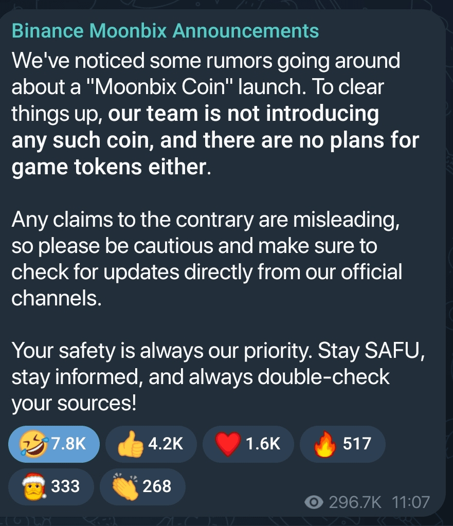 Binance ha appena annunciato sul suo canale ufficiale del social network Telegram che Binance Moonbix NON è e non sarà un token come Hamster, Dogs, Cats, Xempire, ecc.