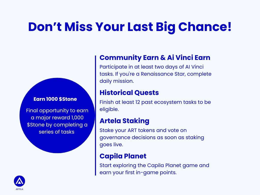 Ora è il momento di farti avanti, guadagnare, impegnarti e assicurarti un posto nel futuro di Artela. Non aspettare fino al lancio della mainnet—tuffati ora e aiuta a plasmare ciò che verrà dopo.