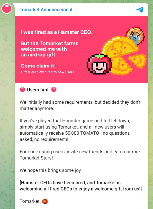 Come riportato nel post su Telegram, Tomarket ha affermato: "I CEO di Hamster sono stati licenziati e Tomarket invita tutti i CEO licenziati a godere di un regalo di benvenuto da parte nostra!"