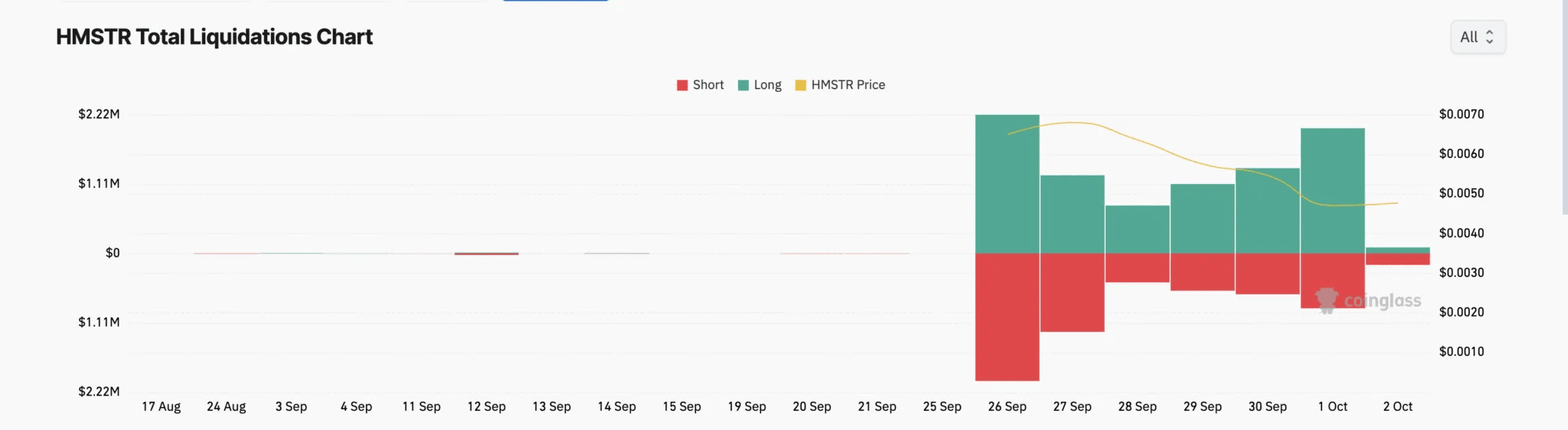 Tuttavia, molte posizioni lunghe sul mercato non sono state redditizie, poiché le liquidazioni continuano. Dal 26 settembre, sono state liquidate posizioni lunghe HMSTR per un valore di 9 milioni di $ a causa del continuo calo del prezzo del token.