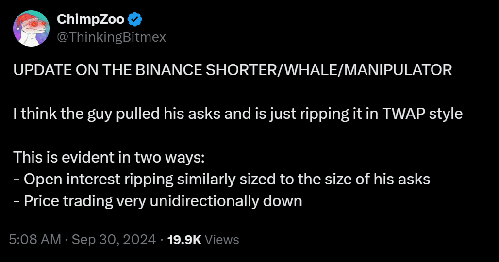 Infine, il presunto "manipolatore" è stato osservato mentre impiegava una strategia di Prezzo Medio Ponderato nel Tempo (TWAP), caratterizzata dall'esecuzione di ordini di mercato a intervalli regolari per minimizzare l'impatto sul mercato. Questo approccio è indicativo di un intento di integrarsi nell'attività di mercato in modo fluido, piuttosto che interromperla. Il TWAP è preferito dai trader istituzionali per la sua efficienza nell'esecuzione di ordini di grandi dimensioni senza un disturbo significativo dei prezzi—difficilmente il modus operandi di qualcuno che mira a manipolare i prezzi.