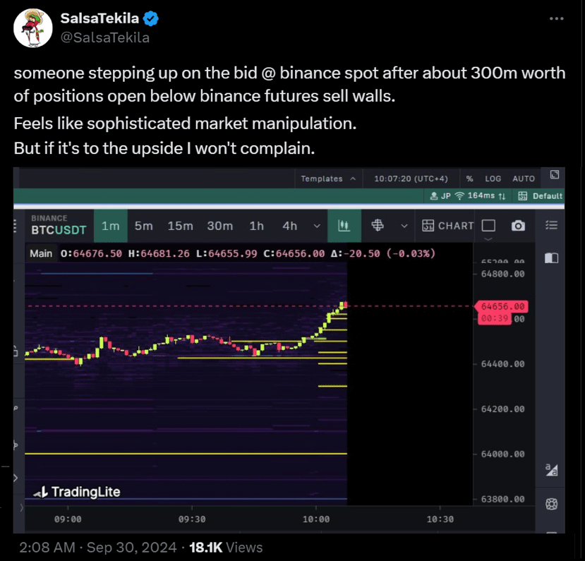 In secondo luogo, la presenza di una significativa attività di acquisto dopo le violazioni di livelli di supporto chiave indica non un singolo ente che manipola il mercato, ma piuttosto più grandi operatori coinvolti in strategie di mercato tipiche. Ad esempio, dopo che Bitcoin ha rotto il livello di supporto di $64,500, gli analisti hanno notato oltre 4.000 BTC in offerte piazzate sui futures, suggerendo un trading attivo e competitivo piuttosto che una compressione unilaterale dei prezzi.