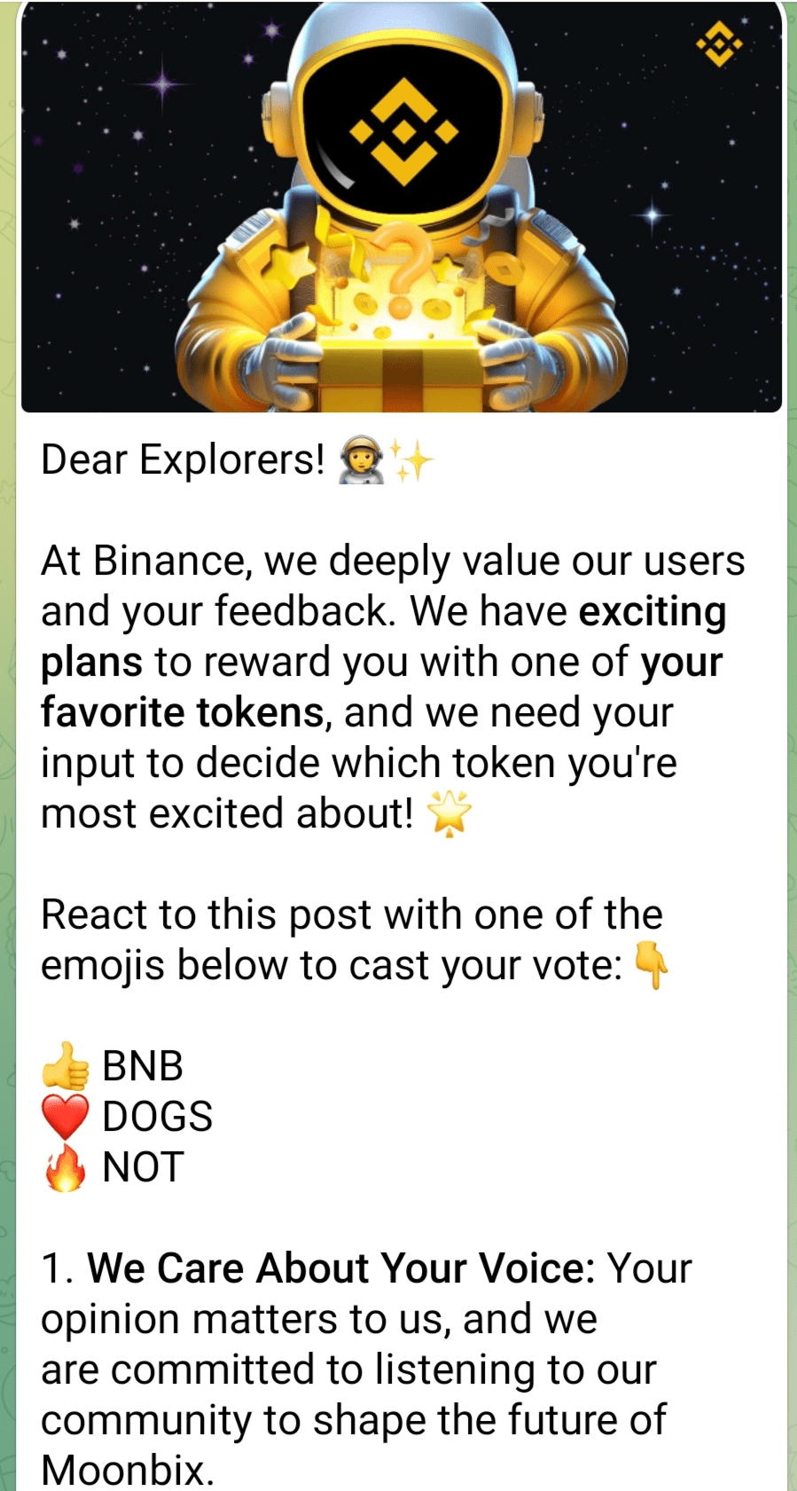 Binance vuole che tu decida quale token riceverai come ricompensa per aver esplorato Moonbix. Esprimi il tuo voto reagendo al loro post con una di queste emoji: