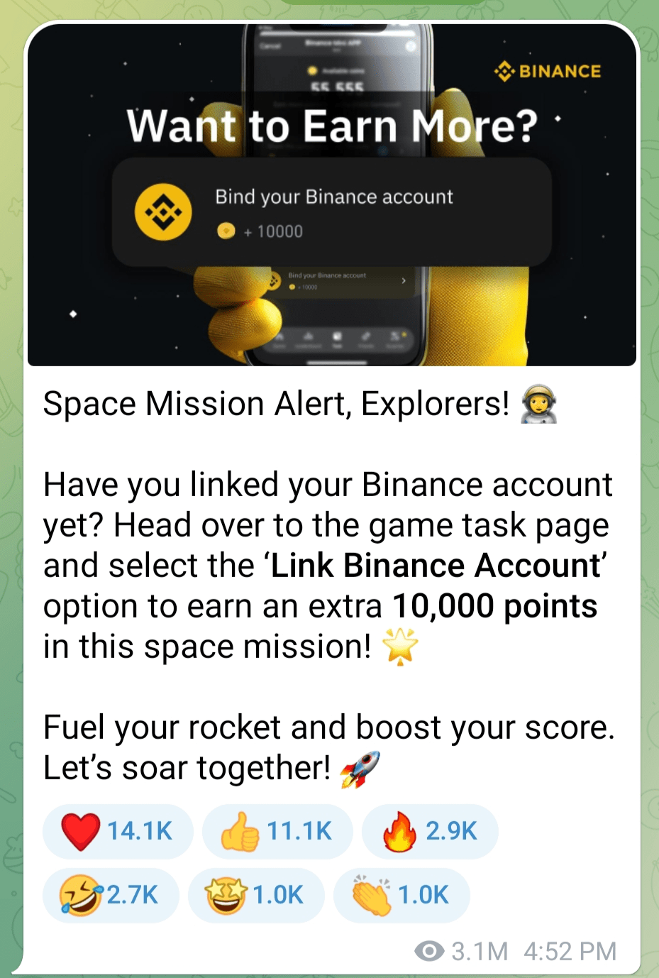 Attenzione alla missione! 🚀 Hai già collegato il tuo account Binance? In caso contrario, vai alla pagina delle attività di gioco, seleziona "Collega account Binance" e guadagna un bonus di 10.000 punti! Questa è la tua occasione per salire di livello, alimentare il tuo razzo e librarti più in alto che mai.