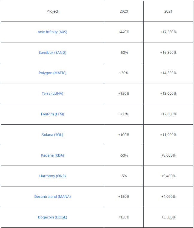 Se diamo un'occhiata ai 10 migliori progetti in termini di performance dell'ultimo ciclo, emerge uno schema: la maggior parte delle monete che hanno avuto buone performance nel terzo anno del ciclo (2020) hanno registrato movimenti parabolici nell'ultimo anno (2021):