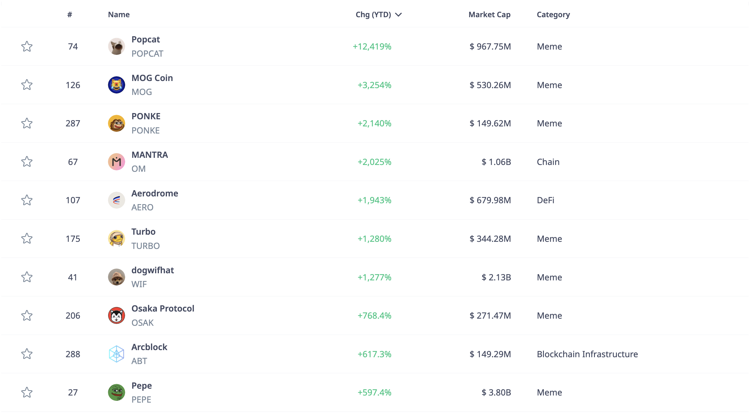 Se utilizziamo tabelle e filtri su CryptoRank.io per ordinare tutte le monete in base alle variazioni di prezzo da inizio anno (YTD) e aggiungiamo un filtro per una capitalizzazione di mercato superiore a 100 milioni di $, vedremo che 7 dei 10 token più forti di quest'anno sono monete meme.