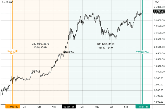 Nel ciclo (III), il dimezzamento è avvenuto l'11 maggio 2020 e l'altseason è iniziata il 3 gennaio 2021, 237 giorni dopo.