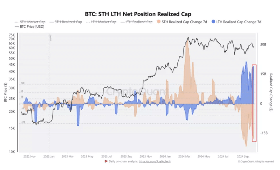 Al 5 ottobre, il volume di capitalizzazione realizzata negli ultimi sette giorni per questa categoria di partecipanti al mercato è aumentato di 6 miliardi di $. In altre parole, gli speculatori (STH) stanno "aumentando i loro long", mentre gli hodler (LTH) stanno "prendendo profitti", hanno osservato gli esperti.