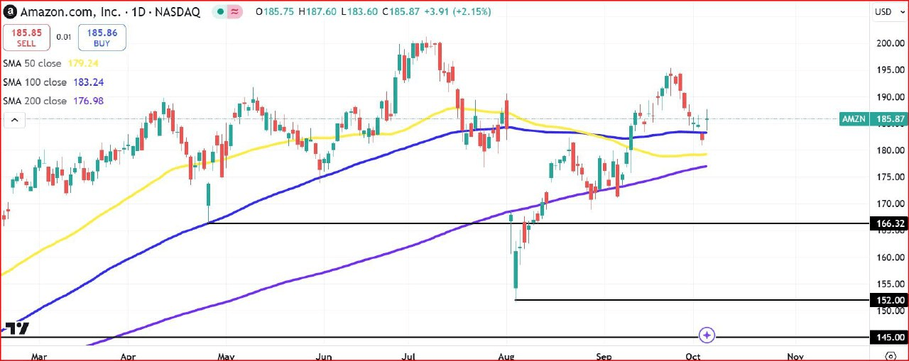 Anche le aziende orientate alla crescita come Amazon trarranno vantaggio da tassi di interesse più bassi. Il rapporto NFP di venerdì è stato abbastanza solido da far sì che il mercato stia ora scontando la sua precedente previsione di un altro taglio di 50 bps alla riunione di novembre della Federal Reserve (Fed). Tutte le scommesse ora puntano a un taglio più piccolo di 25 bps seguito dallo stesso taglio alla riunione di dicembre.
