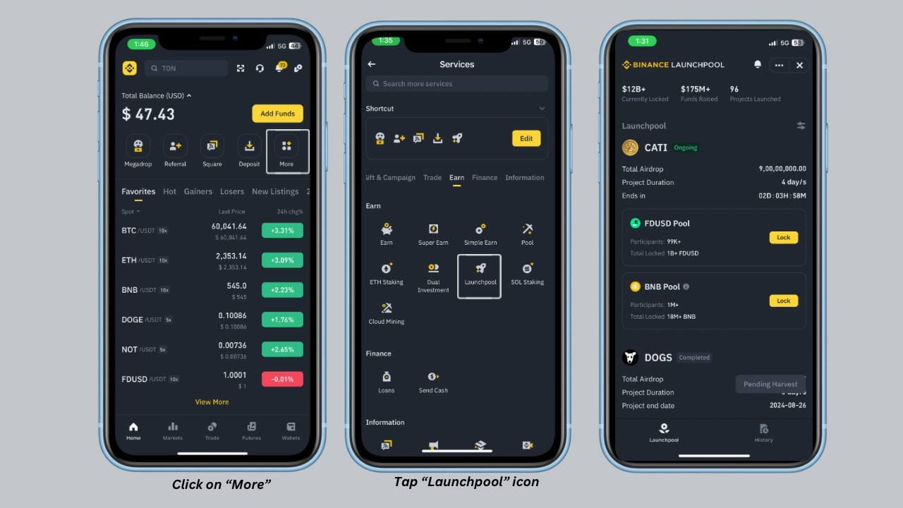Scorri verso il basso fino a Guadagna, trova "Launchpool" e tocca per accedere alla pagina Launchpool
