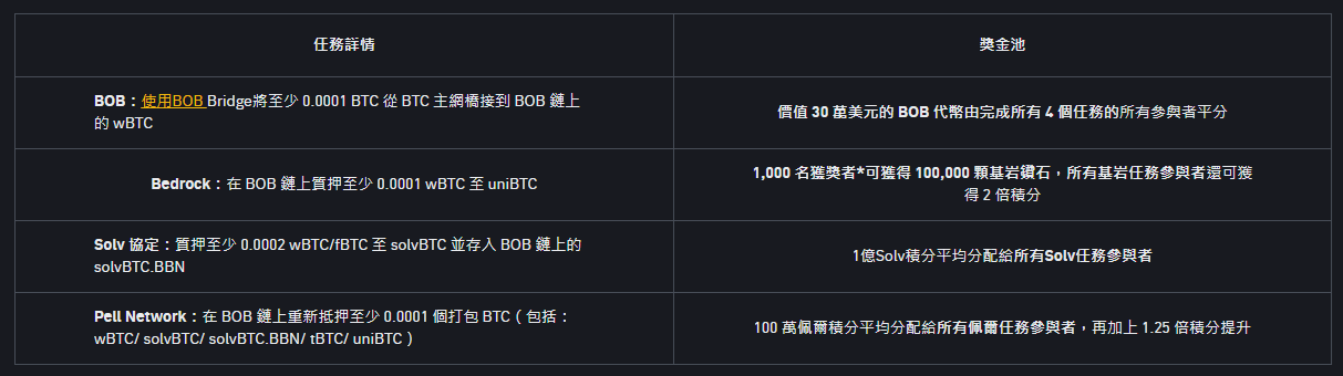 Completare quattro attività equivale almeno a colmare più di 0,0003 $BTC wBTC della catena BOB passata