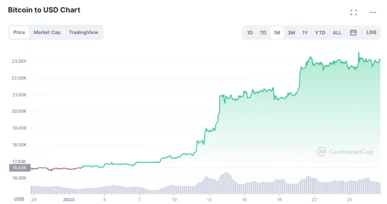 Il prezzo di BTC è aumentato drasticamente all'inizio del 2023.