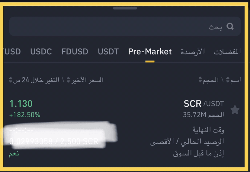 Il pannello di trading apparirà immediatamente e potrai vedere le negoziazioni della valuta dall'inizio del suo lancio sul Pre-mercato e potrai negoziarla, venderla e acquistarla, ma devi tenere presente che non potrai prelevare alcuna valuta da SCR sul tuo portafoglio prima che venga lanciata ufficialmente sulla piattaforma, ma puoi venderla e prelevare i profitti in USDT.