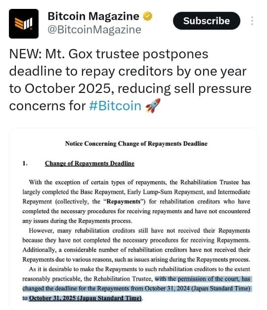 Mt. Gox posticipa il rimborso a ottobre 2025, scatenando incertezza nel mercato di Bitcoin.