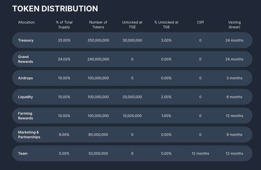 D'altro canto, il piano di vesting di Grand Combat è ben strutturato. Anche il periodo di vesting più breve, per l'airdrop del 10%, è di tre mesi, mentre il periodo di vesting più lungo si estende fino a 24 mesi per la tesoreria e i Grand Rewards.