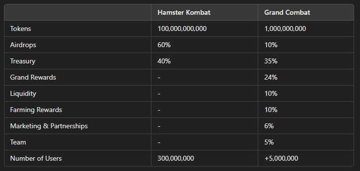 Uno sguardo al grafico sopra evidenzia le differenze chiave. La più ovvia è la dimensione assoluta della fornitura di token di $HMSTR: 100 miliardi contro 1 miliardo di $GRAND, una differenza di 100 volte. Ciò è ulteriormente amplificato se si confronta il numero di utenti: Hamster Kombat vanta circa 300 milioni di partecipanti, mentre Grand Combat ne ha poco più di 5 milioni, una differenza di 60 volte.