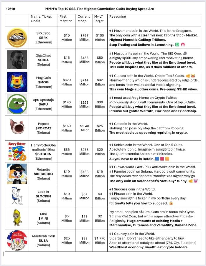 Mentre Murad continua a investire nei memecoin, molti stanno monitorando da vicino i suoi portafogli pubblici per anticipare la prossima grande mossa. Anche se ha rivelato 10 giocate importanti, ce ne sono probabilmente altre sotto il radar. Ecco alcuni dei memecoin che i suoi portafogli hanno apparentemente acquistato: