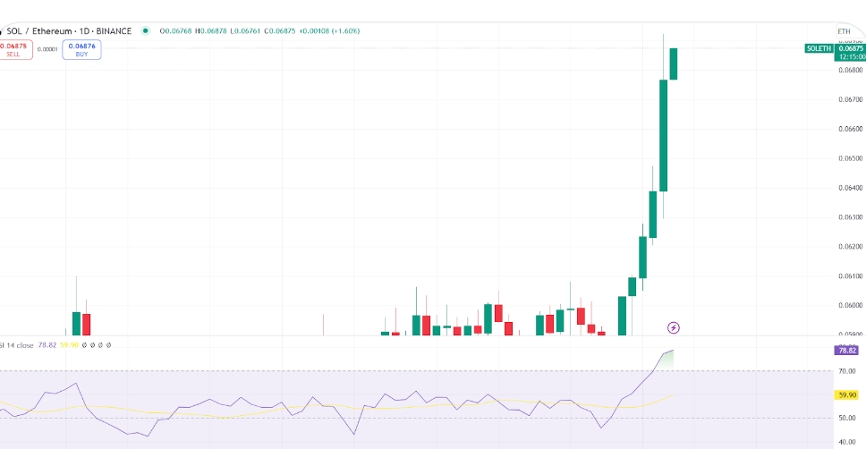 L'indicatore RSI per la coppia SOL/ETH sul grafico giornaliero è ora a 78,17, entrando nella zona di ipercomprato. Tradizionalmente, questo segnala una potenziale correzione di prezzo, anche se non garantisce un ritorno imminente. Potrebbe suggerire che il mercato potrebbe raffreddarsi prima di continuare la sua traiettoria rialzista.