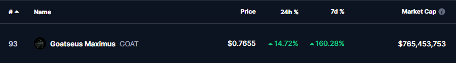 Oggi, il più grande exchange di criptovalute al mondo, Binance, ha aggiunto GOAT alla sua piattaforma di trading di futures. L'annuncio ha fatto schizzare il token al suo nuovo massimo storico e ha assicurato il suo posto tra le prime 100 criptovalute per capitalizzazione di mercato. Attualmente classificata al n. 93, la capitalizzazione di mercato di GOAT è di ben 765 milioni di $.