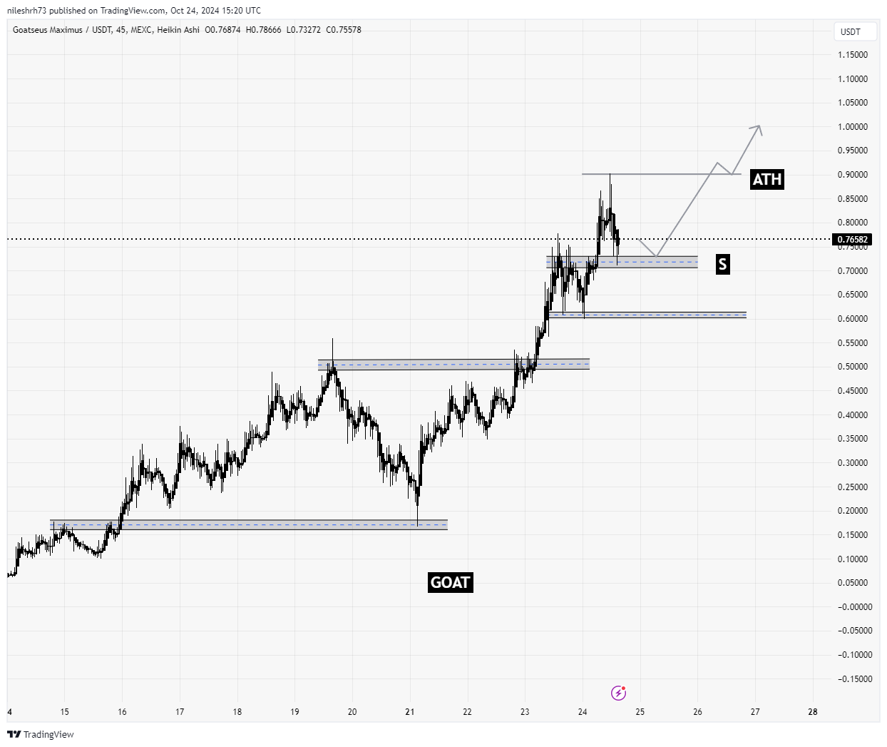 Come molti altri token, $GOAT sta vivendo un ritracciamento dopo il pump iniziale di Binance. Il token è attualmente scambiato a $0,76, in calo del 17% rispetto al suo massimo storico di oggi. Tuttavia, ha trovato supporto nell'intervallo $0,70-$0,72.