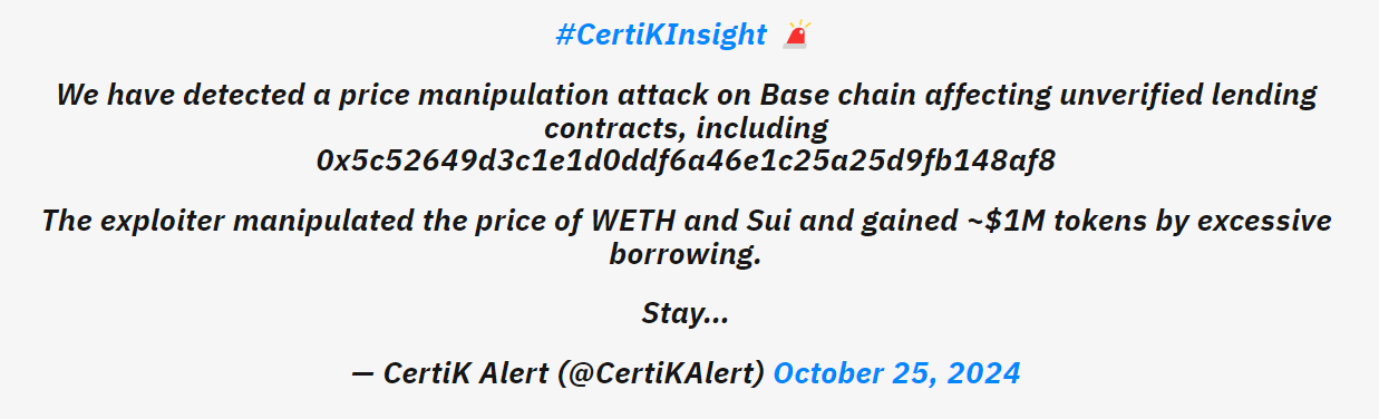 Questa mattina presto, il sistema di monitoraggio CertiK Alert ha informato gli utenti sulla piattaforma X riguardo all'attacco in corso. Secondo il rapporto, l'attacco ha preso di mira la catena Base e ha colpito un contratto di prestito non verificato che inizia con l'indirizzo 0x5c52.