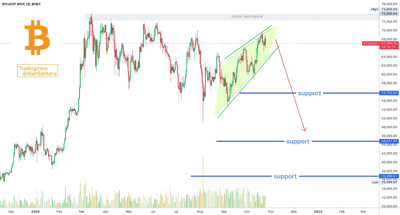 Bitcoin ha prodotto un massimo inferiore il 21 ottobre rispetto al 29 luglio. Si stava muovendo verso l'alto all'interno di un canale ascendente e non appena si è avvicinato a 70.000 ha affrontato una forte resistenza. Il prezzo massimo colpito nella correzione invertita è stato di 69.555 e poi una lieve discesa di tre giorni.