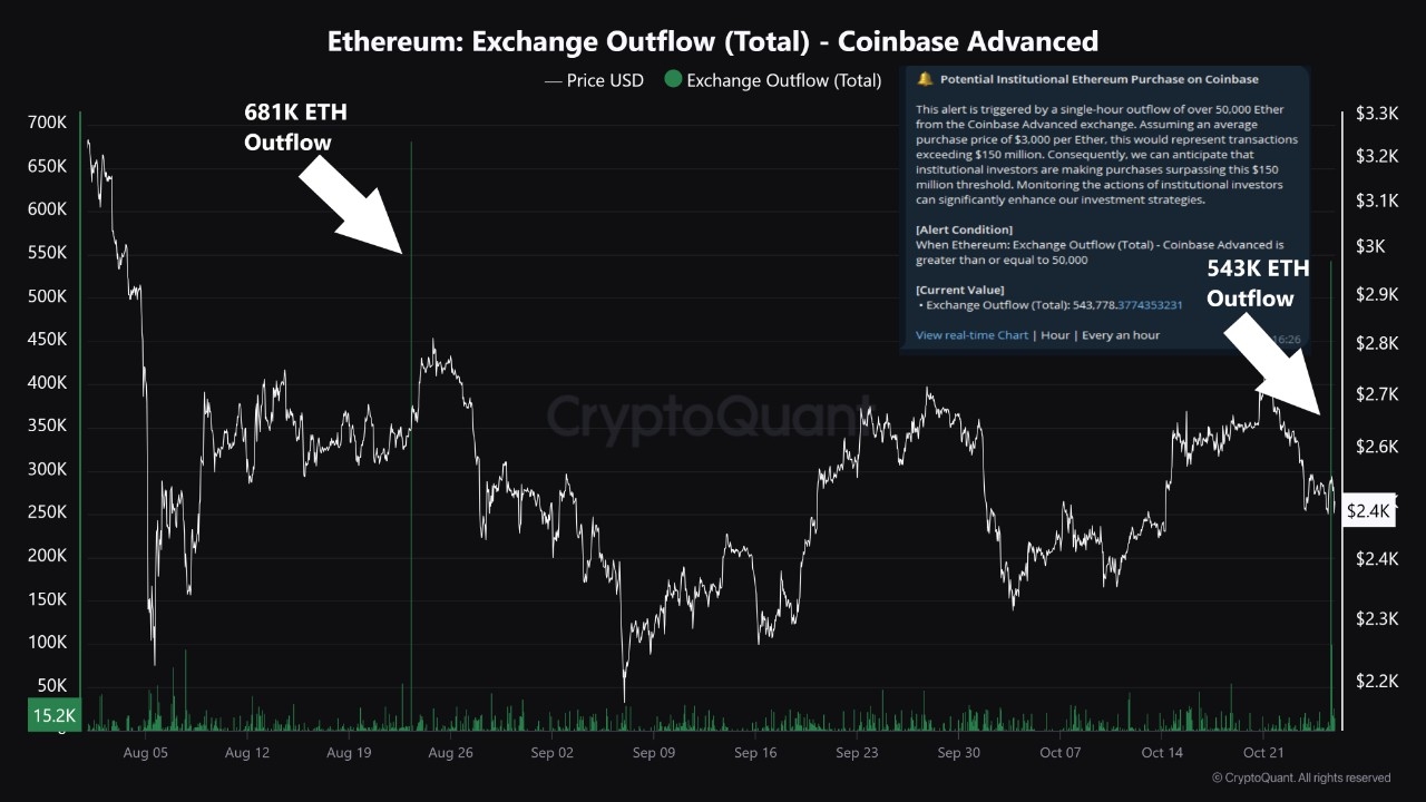 Il recente aumento dei deflussi di Ethereum da Coinbase indica una potenziale ondata di interesse istituzionale, secondo i dati condivisi dall'analista di CryptoQuant Burak Kesmeci.