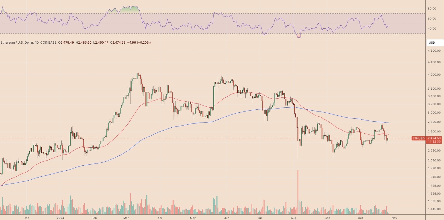 Ethereum (ETH), il token nativo di Ethereum, è sulla buona strada per registrare la prima perdita di ottobre dal 2018, dopo aver perso il 5,40% dall'inizio del mese per raggiungere i 2.475 dollari il 27 ottobre.