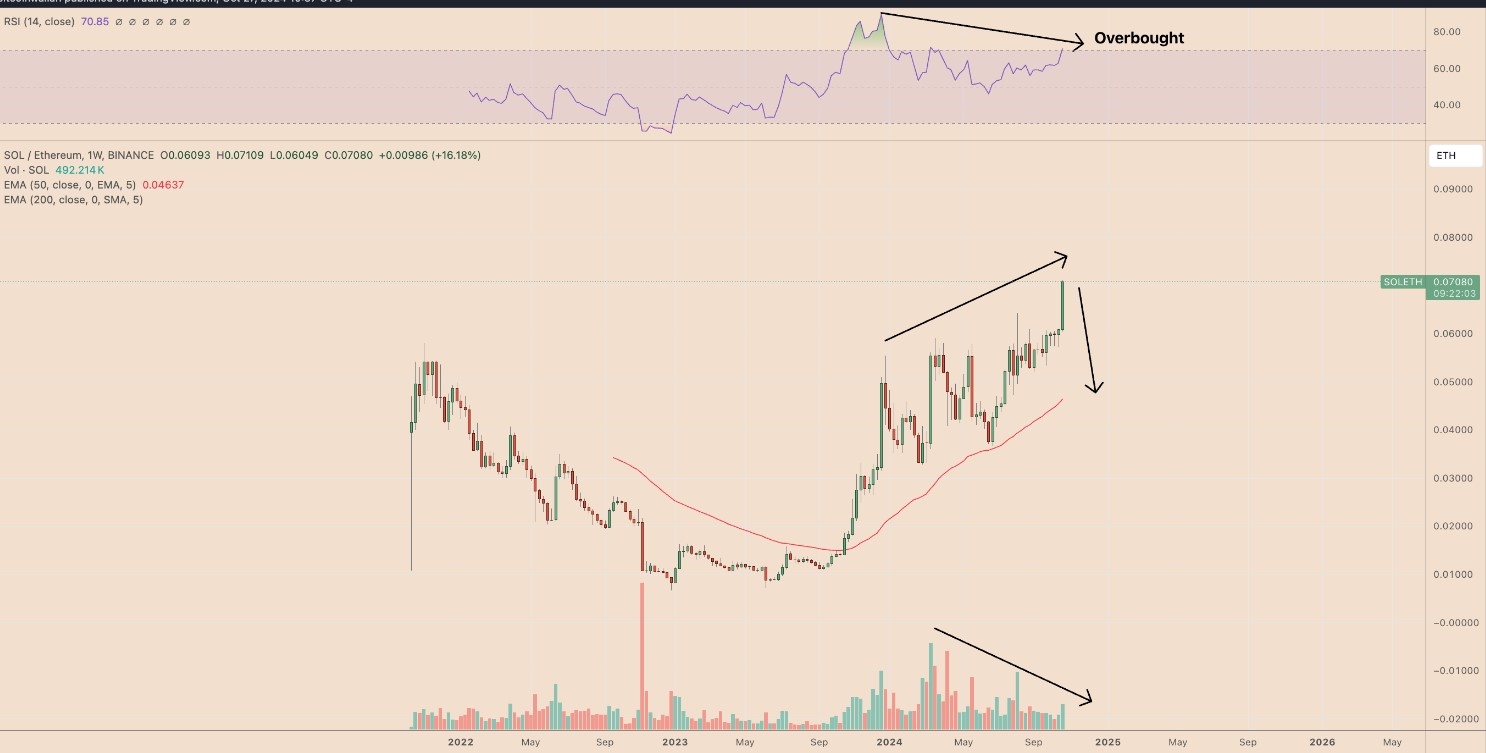 La divergenza ribassista in SOL/ETH, insieme a RSI e volumi inferiori, indicano una debole pressione d'acquisto e una possibile correzione dei prezzi. Storicamente, le condizioni di ipercomprato hanno spinto SOL/ETH verso la sua EMA a 50 settimane, suggerendo un potenziale calo del 35%.