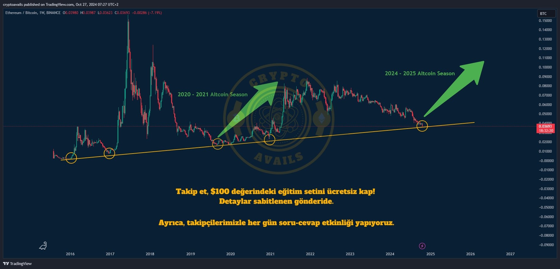 L'analista di Crypto Avails conferma inoltre che i precedenti rialzi della coppia ETH/BTC dal suddetto supporto della trendline hanno coinciso con l'inizio della “stagione delle altcoin”, la fase in cui le altcoin sovraperformano Bitcoin.