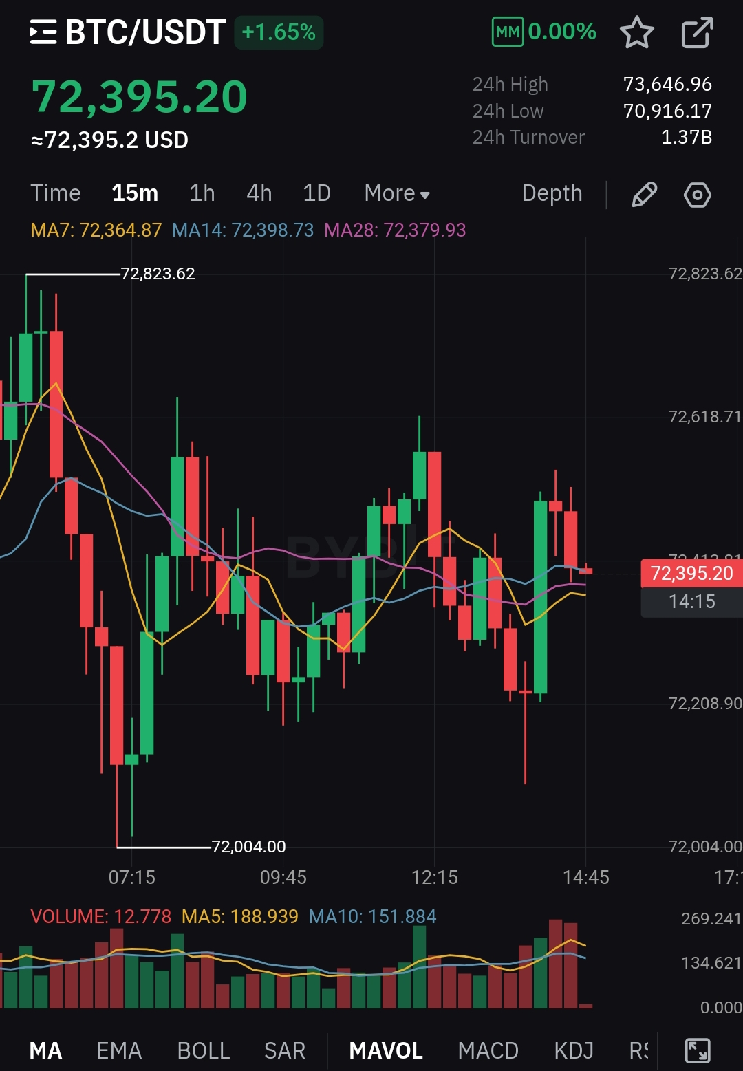 L'analisi del grafico BTC/USDT a 15 minuti indica che il mercato si trova attualmente in una fase relativamente stabile. La stretta allineamento di MA7, MA14 e MA28 suggerisce una fase di consolidamento, con il prezzo che oscilla intorno a 72.400 dollari. Il massimo e il minimo delle ultime 24 ore mostrano una notevole volatilità recente, ma il prezzo ora si trova vicino al punto medio.
