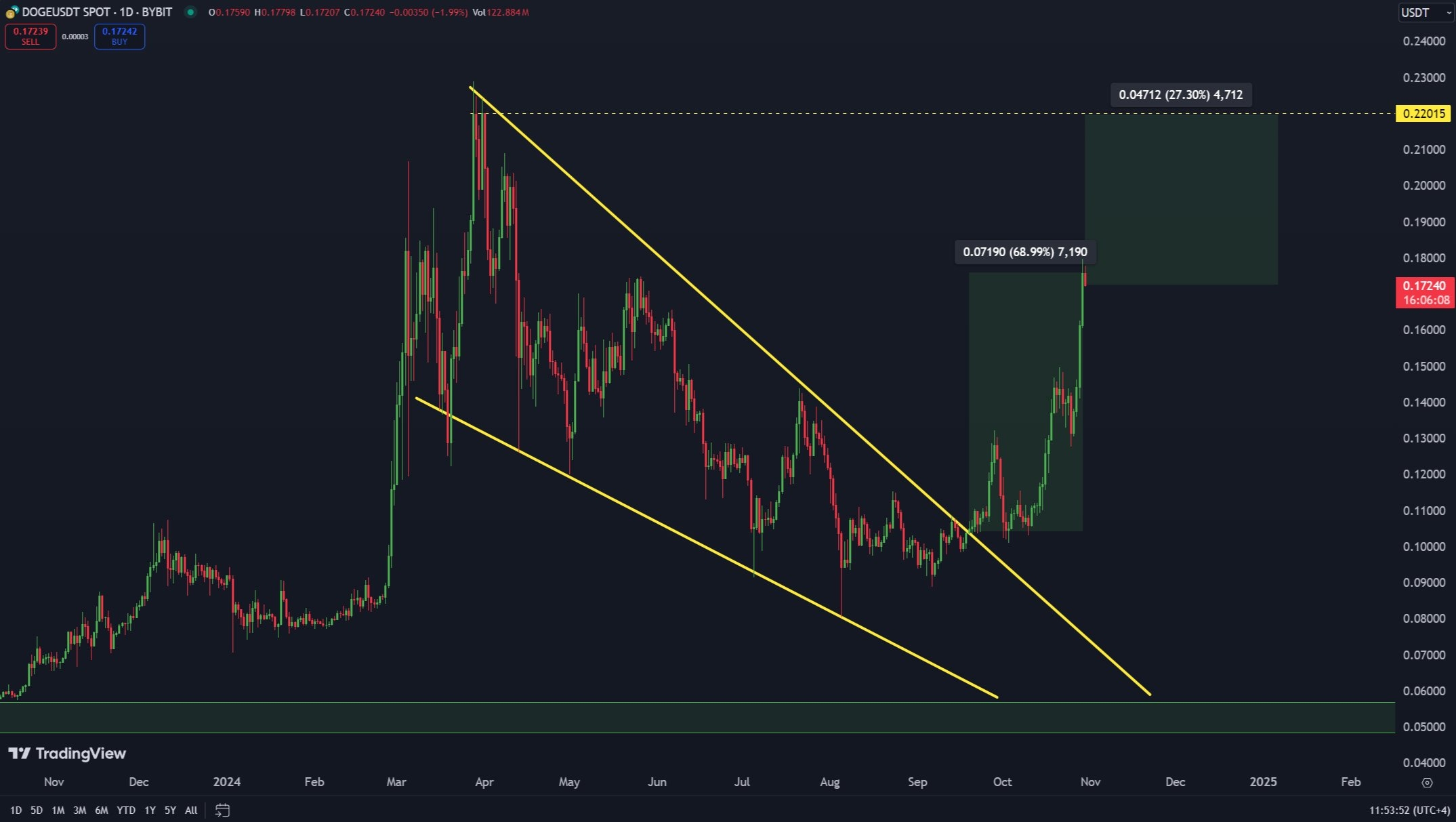 “DOGE ha ancora spazio per crescere! L’obiettivo di uscita per questo cuneo in calo è $ 0,22015.”